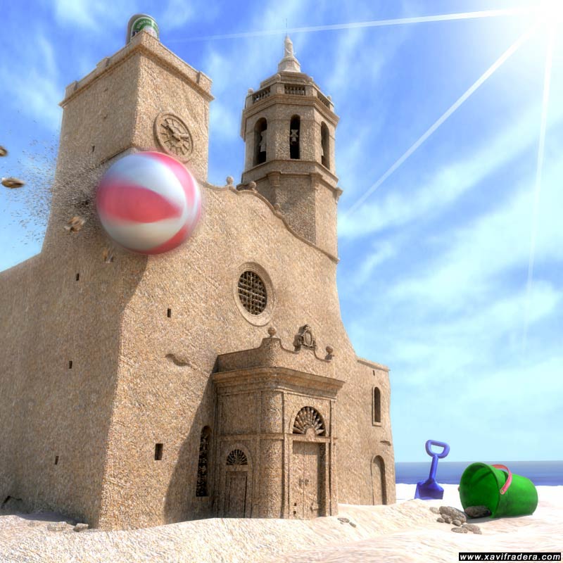Step 5: At this point, I've decided to make a sand sculpture about the church for many reasons. I created several sand textures for different things (ground, sculpture, sand lumps, flying sand...). I added few beach details I going to improve latter. I added too, a ball collision agaist the square tower. I going to improve latter too. I added too, the cloudy sky, it look much better this way. I have to add more detail to some church parts, like doors hinges and lattices on windows. I'm going to add some noise to make it more sand sculpture look.