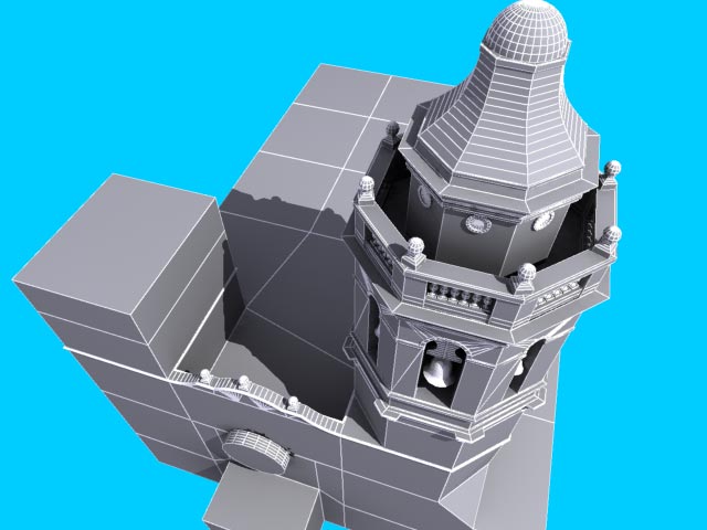 Step 3: All main things are modelled, even the surroundings of the church. Now it's ready to add details to make it appear more reallistic, and prepair the model for texturing.