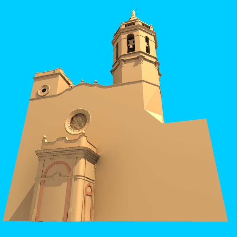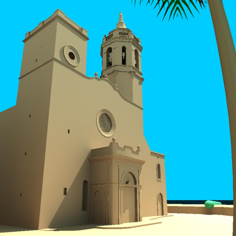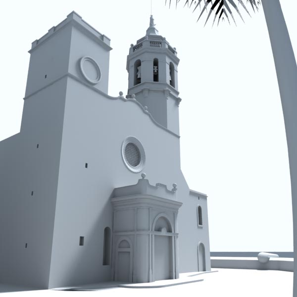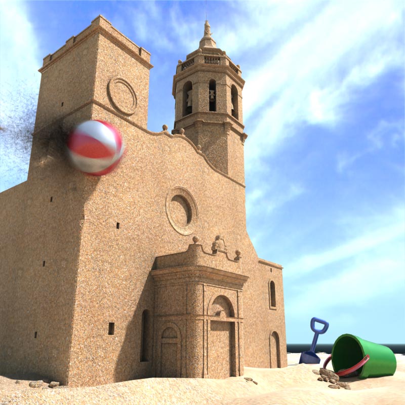 Step 5: At this point, I've decided to make a sand sculpture about the church for many reasons. I created several sand textures for different things (ground, sculpture, sand lumps, flying sand...). I added few beach details I going to improve latter. I added too, a ball collision agaist the square tower. I going to improve latter too. I added too, the cloudy sky, it look much better this way. I have to add more detail to some church parts, like doors hinges and lattices on windows. I'm going to add some noise to make it more sand sculpture look.